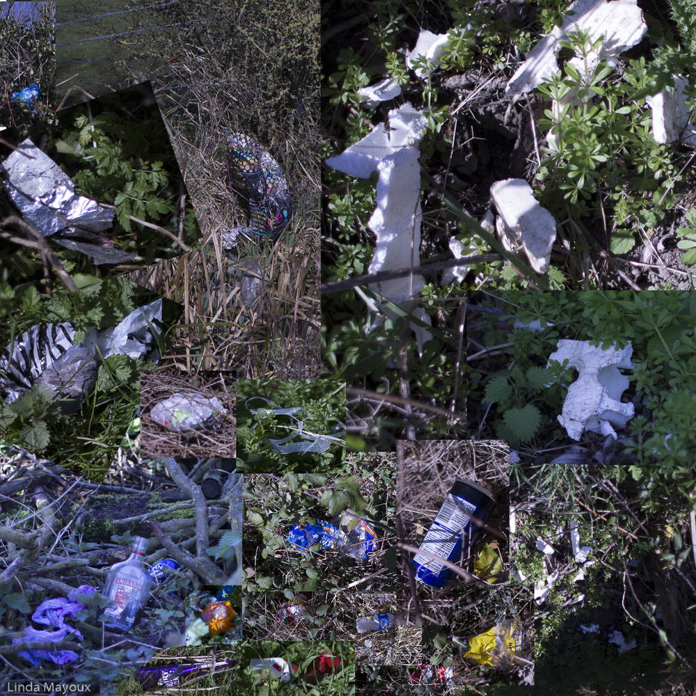 This image is just a preliminary idea – a photomontage of many (but not yet all) the litter I photographed that day. The aim is to make the image of litter look like a nature photograph – spring meadow and nesting birds.I like the square format – linking different elements in a cluttered space like litter or a nest. I like the striped plastic bag like an agonised rat on the left and the multicoloured foil balloon that rears up like a snake in the grass.